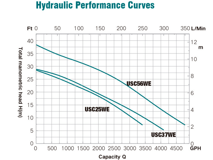 GPH of Water @ Total Ft of Head: 5ft = 4750, 10ft = 4030, 15ft = 3170, 20ft = 2200, 25ft = 1200