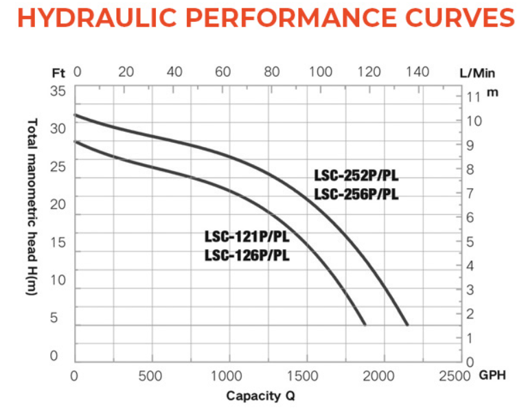 GPH of Water @ Total Ft of Head: 5ft = 2110, 10ft = 2000, 15ft = 1850, 20ft = 1650, 25ft = 1300