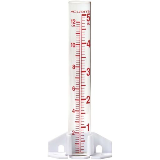 Rain Gauge has 5” capacity with 1/10th graduations also is marked in centimeters. Comes with a aluminum bracket. Blister packed. Wt. 0.08 lb.