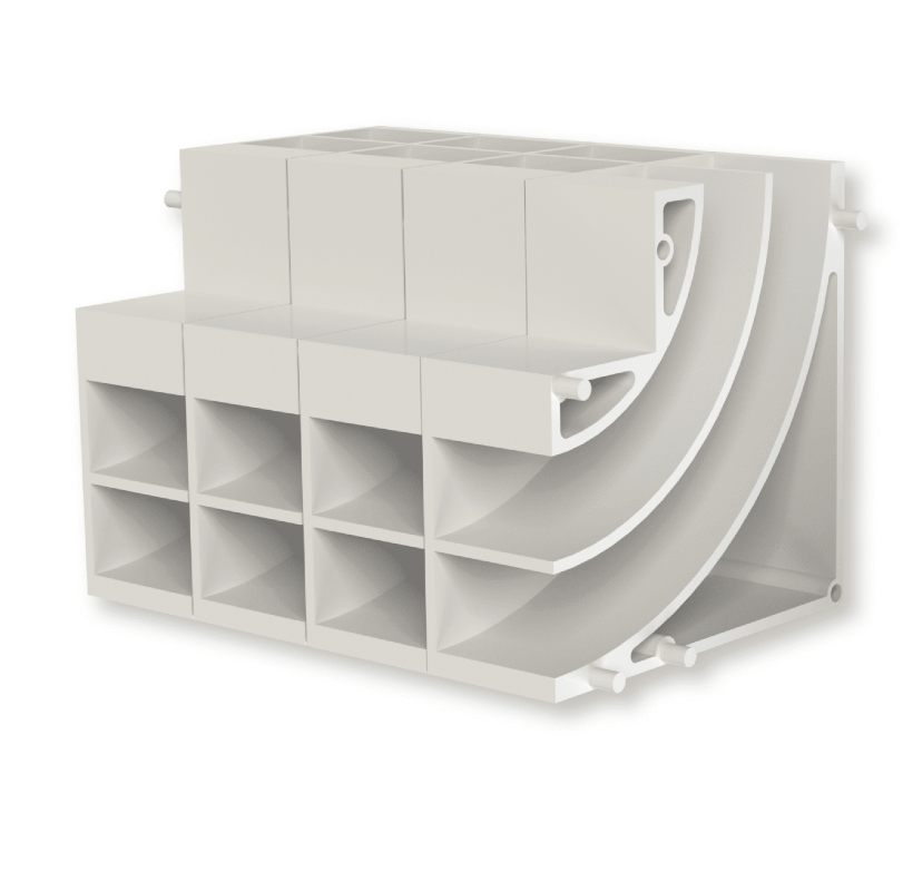 2 channel connector. Modular design positions the supply and return pipes at the correct spacing required for connection to manifolds. Protects the tubing at floor surface. Order as many collectors as you have loops, and add one end plate.
