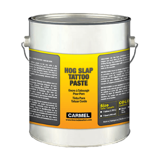 Specially designed tattoo ink paste for slap tattooing hog shoulders. For use with hog tattooing tools.