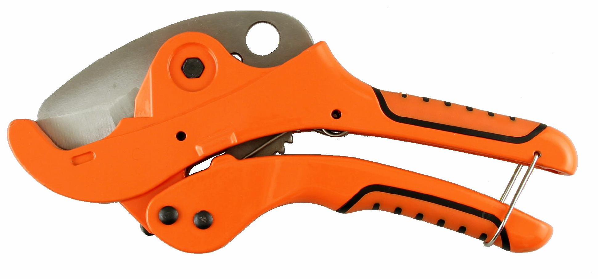 Cuts through 1-1/4" POLY, PVC, PEX, ABS and CPVC pipe or conduit. (Max OD 1.6"). Heavy duty cast metal handle.
