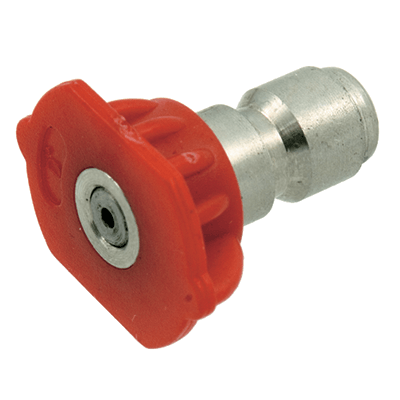 Spray tips are designed by the spray angle (a narrower angle produces more force over a small area, which is great for tough jobs but may gouge or strip softer surfaces), and by orifice size. The orifice size designates the gallons per minute flow at 4000 PSI. Spray tips are available colour coded by spray angle and quick disconnect ends.