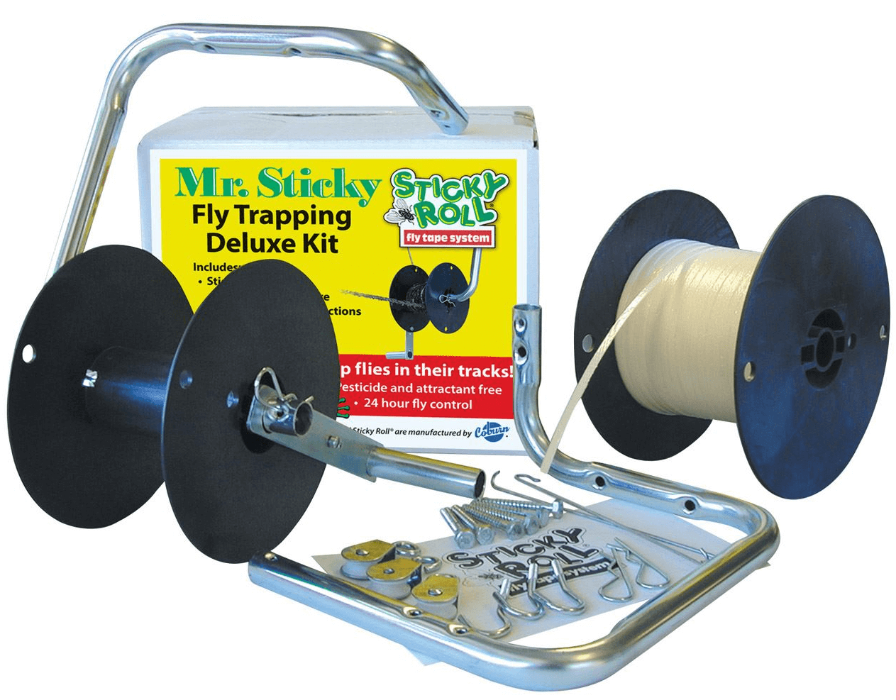 Sticky Roll™ effectively catches, controls and eliminates flies because it’s based on their natural habits. Flies follow the warm updrafts in rooms and barns, seeking a resting place near the ceiling. They become entrapped in Sticky Roll, then become an irresistible attractant to other flies. No baits, toxins, or pheromones are necessary. Soon the tape is black with dead flies. When a length of tape is full, crank it up, flies and all onto the disposable take-up reel. Fresh tape is rolled out at the same time, ready to grab more flies.