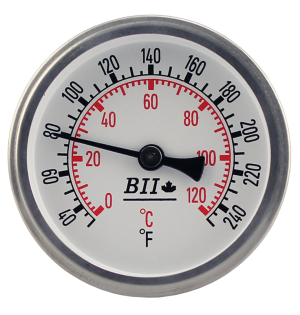 Temperature Gauge 32-250F/ 0-120C, 1/2"MPT. 2-7/16" probe. 3" dial.